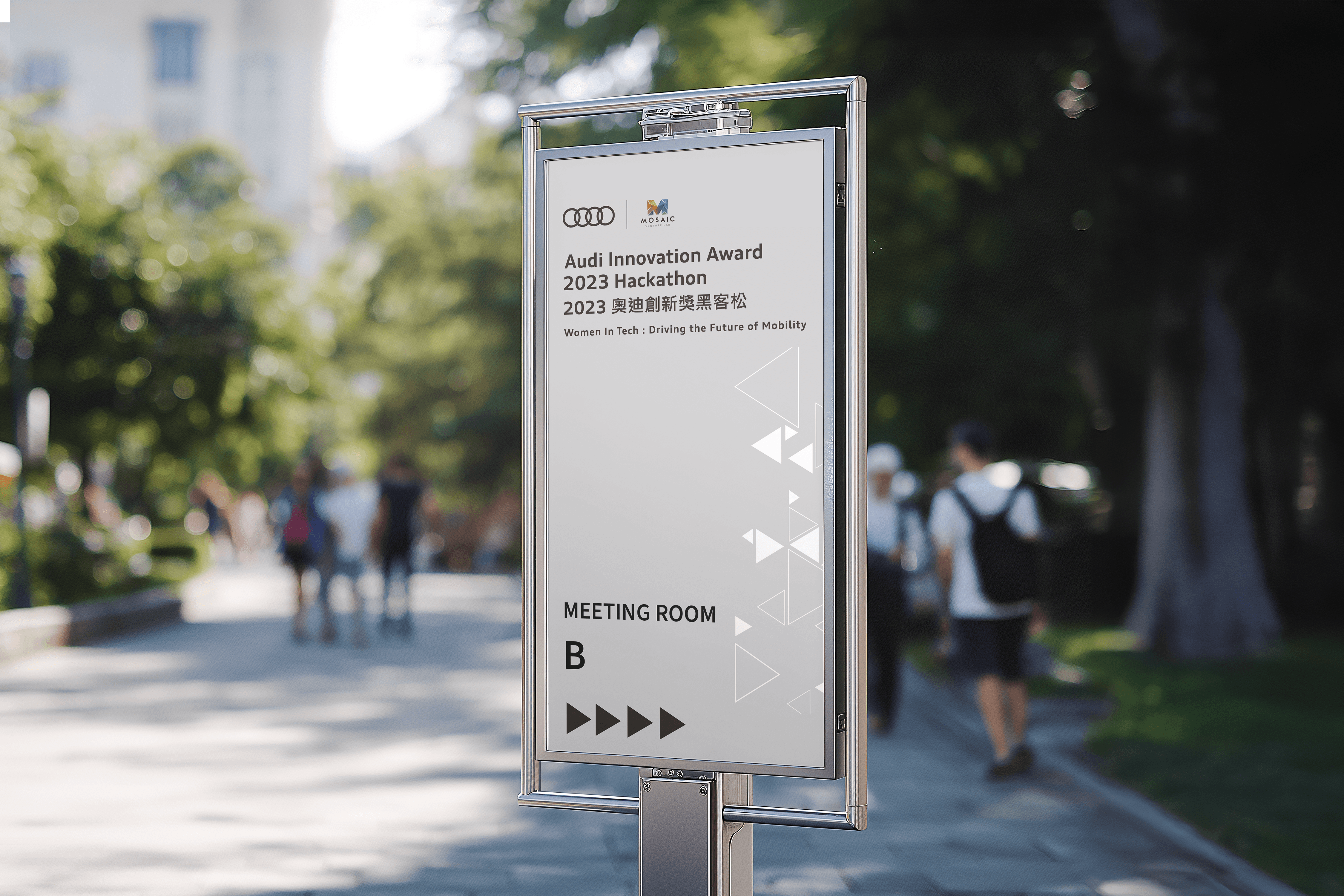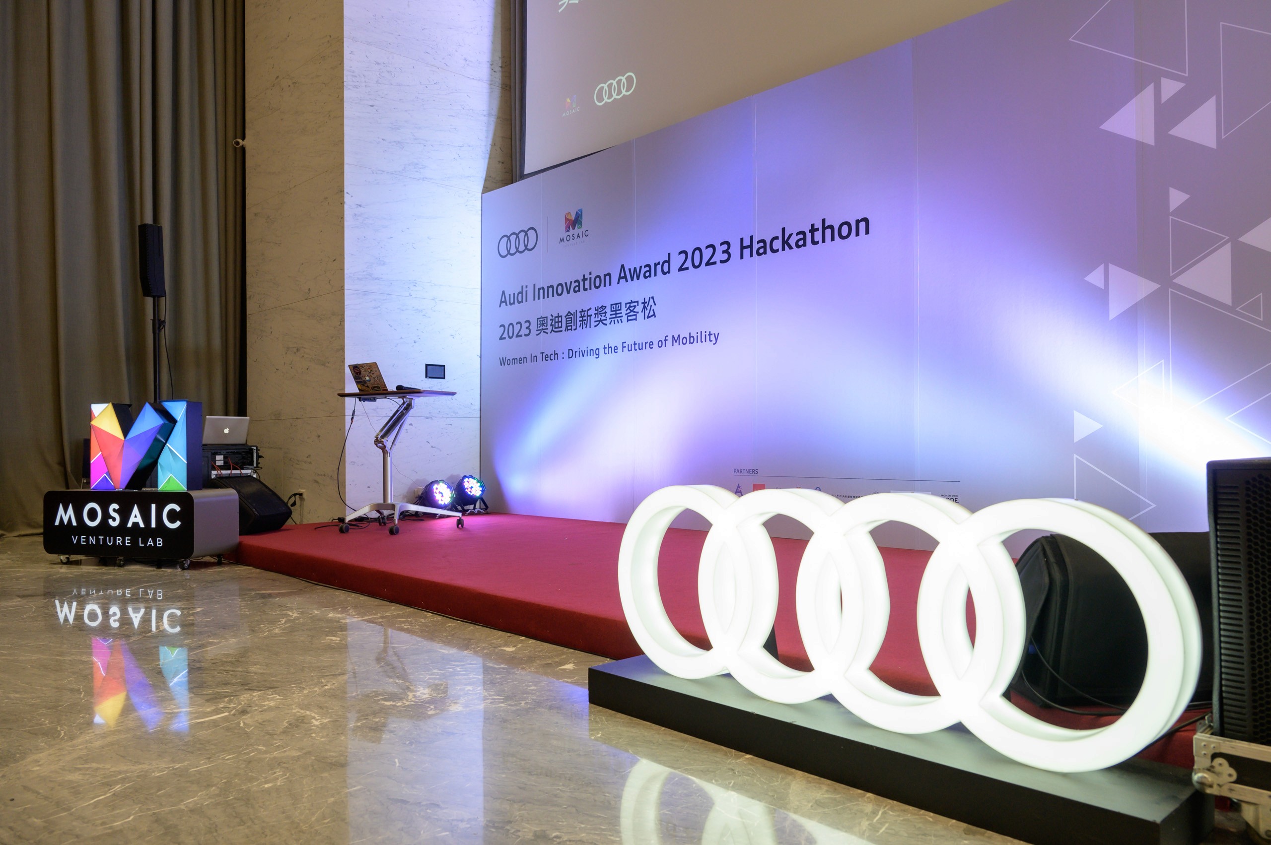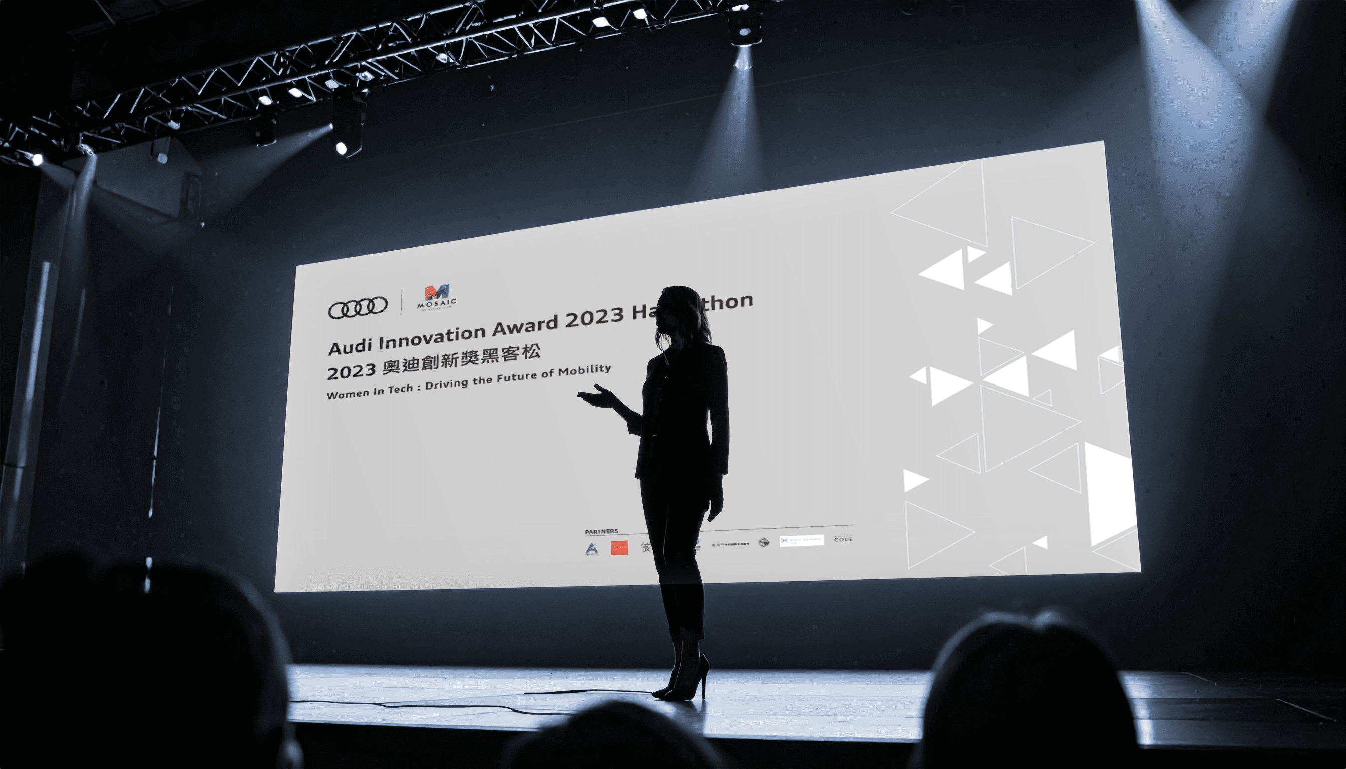 Audi Taiwan organized this hackathon under the theme "Women In Tech: Driving the Future of Mobility." The event brought together female tech talents to utilize innovative technology for the purpose of optimizing customer services. Inspired by Audi’s pillars of Movement, Precision, and Innovation, the design employs sleek geometric forms and dynamic compositions to bridge corporate heritage with the future of mobility.