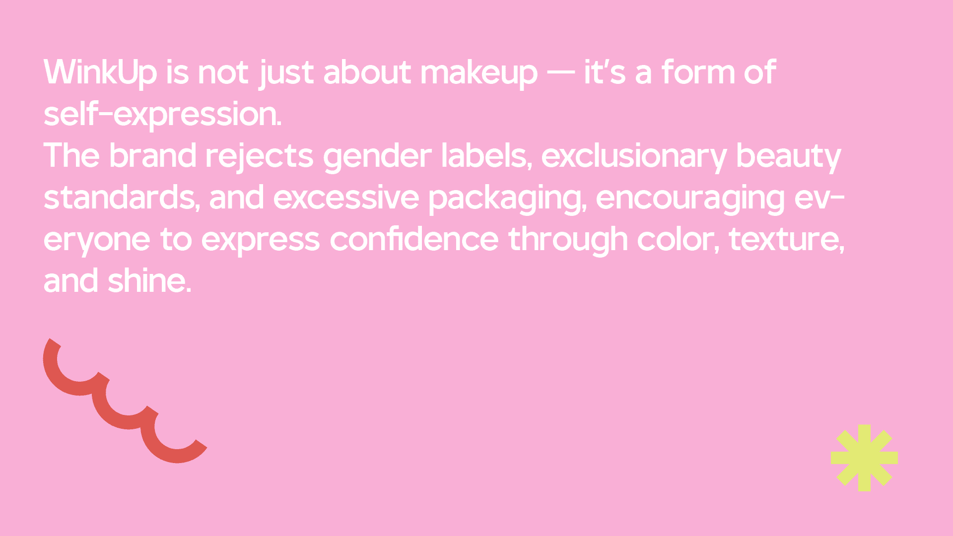 WinkUp is a conceptual makeup brand designed to challenge traditional aesthetic frameworks. The core principle of the brand is De-labeling, rejecting the definition of beauty by gender binaries or singular aesthetic standards. WinkUp views makeup as a pure form of self-expression, encouraging users to showcase a fluid and diverse confidence through color, texture, and shine.